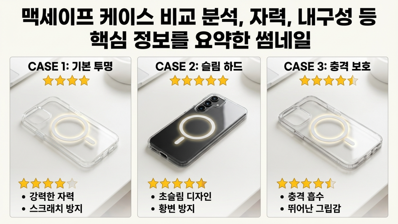 저렴한 맥세이프 케이스의 성능(자력, 내구성, 마감)을 실제 사용자 리뷰를 통해 검증하고, 가격 대비 만족도를 분석하는 콘텐츠.
